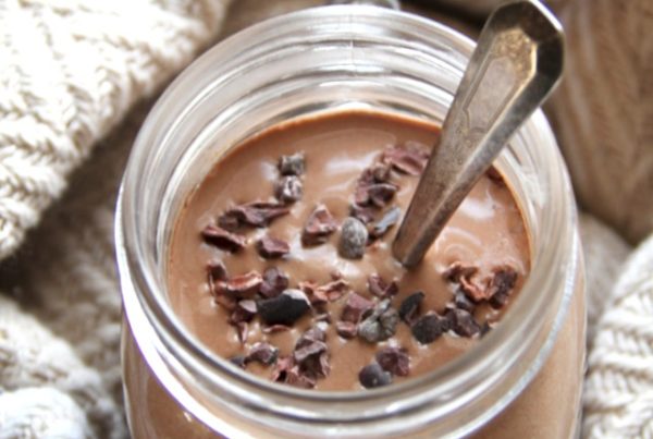 7. Mentre cuociono, preparare la glassa. Montare la crema di formaggio con la marmellata per ottenere una glassa leggera e soffice. Opzione: aggiungere qualche goccia di colorante rosso vegan alimentare.