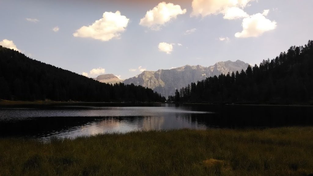 Vista lago con chiesetta sullo sfondo Il lago di Favogna è un laghetto alpino poco profondo, situato sull'altipiano di Favogna a 1034 m nel comune…